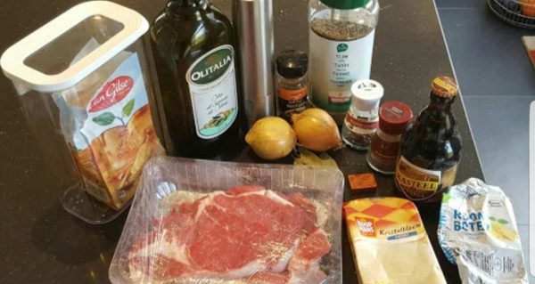 Voeg nu stapsgewijs 1 flesje bier toe moet een beetje roux worden en goed roeren, voeg vervolgens de peren de kruidnagel, suiker, azijn, laurierblad, tijm, piment en het bouillonblokje toe en roer het goed door elkaar. Als laatste voeg je de gebakken runderriblappen toe en eventueel op smaak brengen met peper en zout.