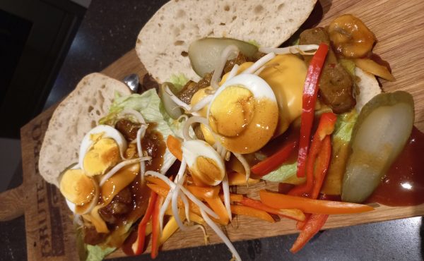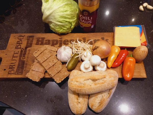 2 Mexicano’s ontdooid, 2 pistoletjes, 1 augurk in plakjes, 1 plakje cheddar kaas, 3 snoep paprika’s rood geel oranje, ijsbergsla, 1 ui, 3 teentjes knoflook, 1 ei hard gekookt, 6 champignons in plakjes, 50 ml zoete chilisaus, 50 ml coca cola, 1 handje taugé, roomboter om in te bakken.