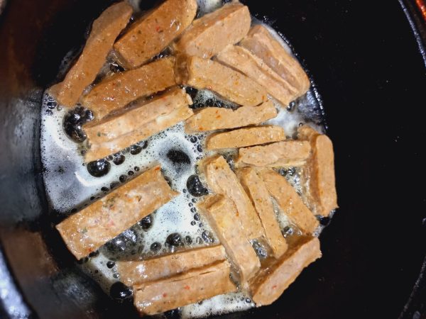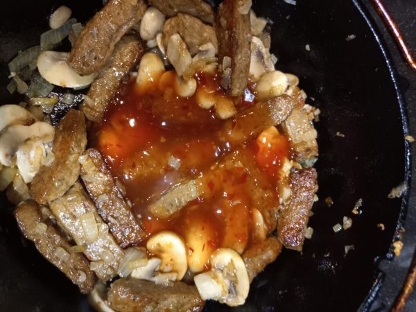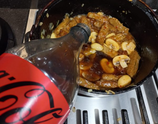 Nu mag er de cola bij roer weer even door en laat alles even lekker pruttelen zodat de saus wat indikt.
