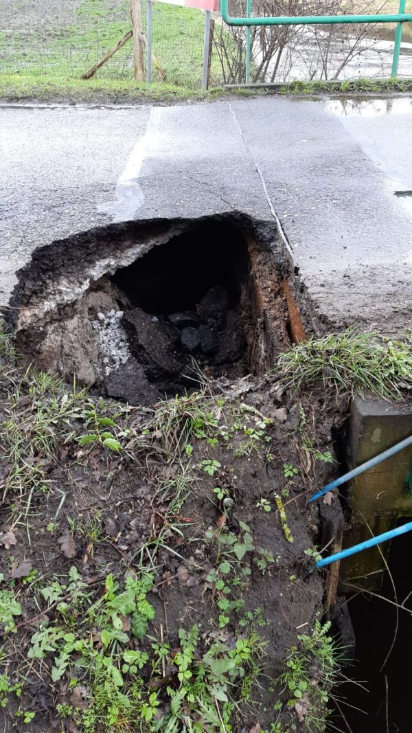 Het gat, van ongeveer een meter diep, werd woensdagmiddag ontdekt. De weg blijft voorlopig afgesloten voor al het verkeer totdat verdere inspecties zijn afgerond en de nodige herstelwerkzaamheden zijn uitgevoerd. Fietsers, voetgangers en automobilisten moeten een andere route nemen. Omdat nog niet duidelijk is of het zand ook onder het wegdek is weggespoeld waar het asfalt niet is verzakt, is de hele weg uit voorzorg afgesloten voor verkeer.