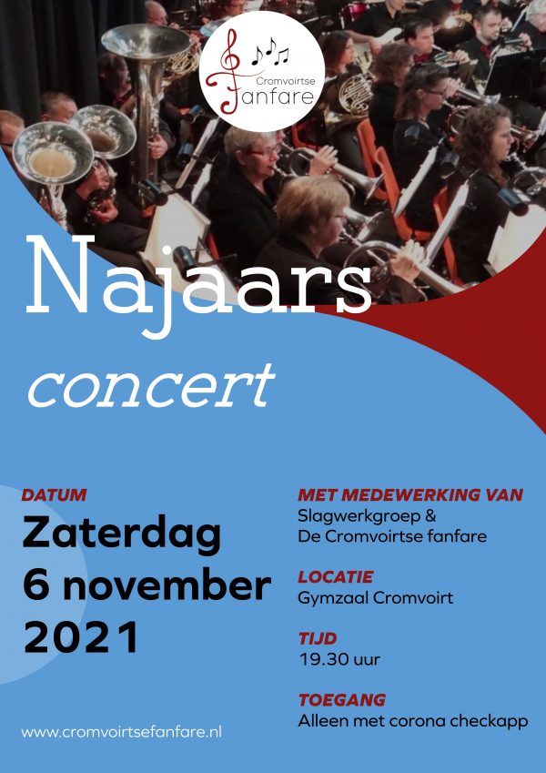 Bij de entree zullen we vragen om uw CoronaCheckapp met ID te tonen. Mochten er veranderingen plaatsvinden i.v.m. de maatregelen, dan zullen deze via social media en onze website www.cromvoirtsefanfare.nl gecommuniceerd worden.